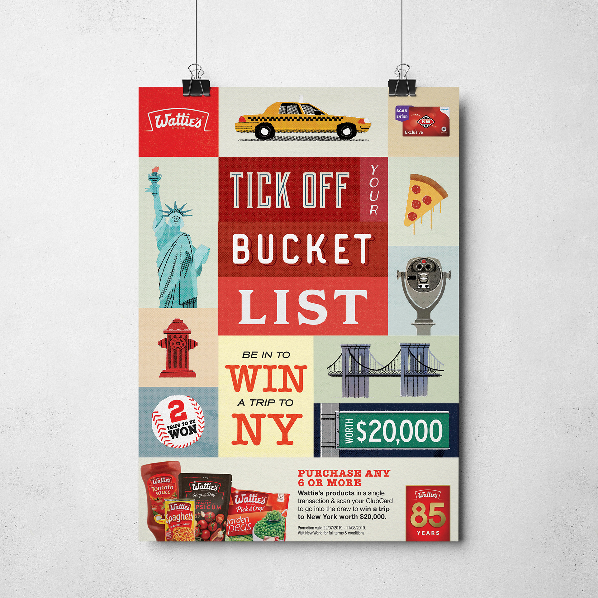 Wattie's New York promotion for New World Supermarkets across New Zealand Client: Heinz Wattie's Ltd Designed while employed at The Business Marketing Group.